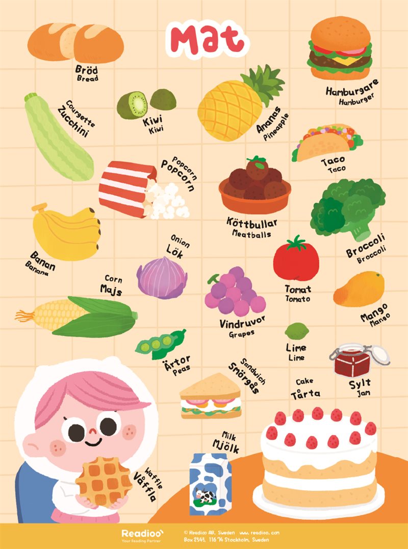 Läs och lyssna till vad maten heter – både på svenska och engelska. Häng upp postern i barnrummet eller på förskolan för att göra det tillgängligt för barnet att öva när som helst!